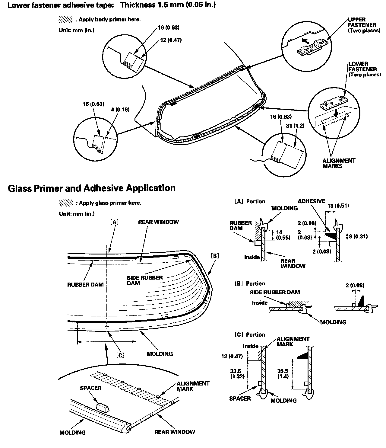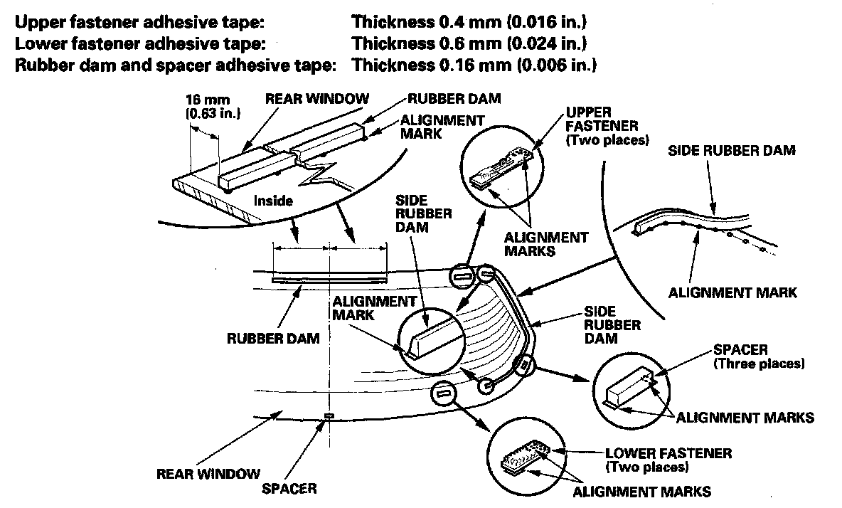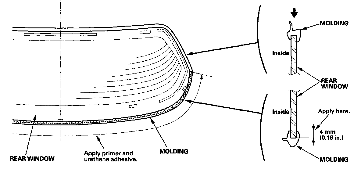 To attach the molding, apply a light coat of primer to the bottom area on the outside of the rear window, and attach the molding with urethane adhesive.