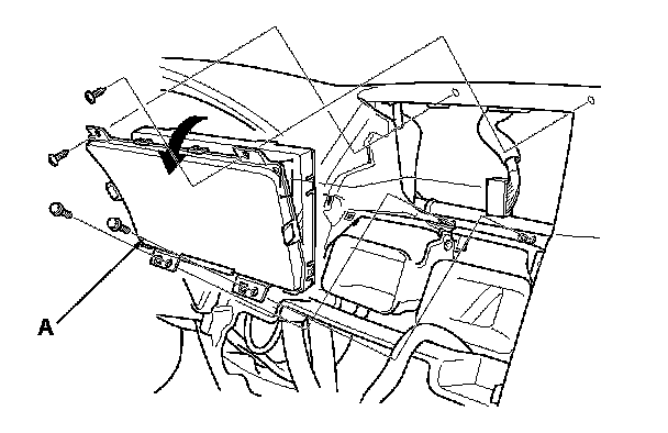 1. Remove the audio unit Audio Unit Removal/Installation (With Navigation), then remove the center display visor. Center Display Visor Removal/Installation (Without Navigation)