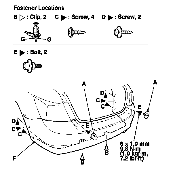 1. Remove the caps (A). Remove the clips (B), the screws (C, D), and the bolts (E) securing the rear bumper (F).