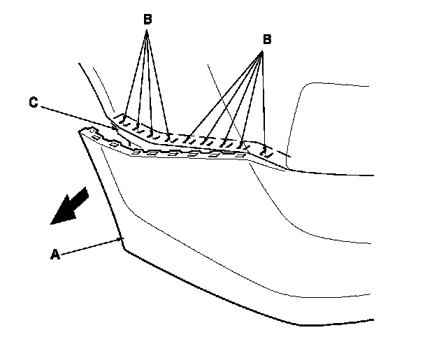 5. Remove the rear bumper absorber (A) from the rear bumper beam (B) by pulling the absorber to release the projections (C) on both sides.