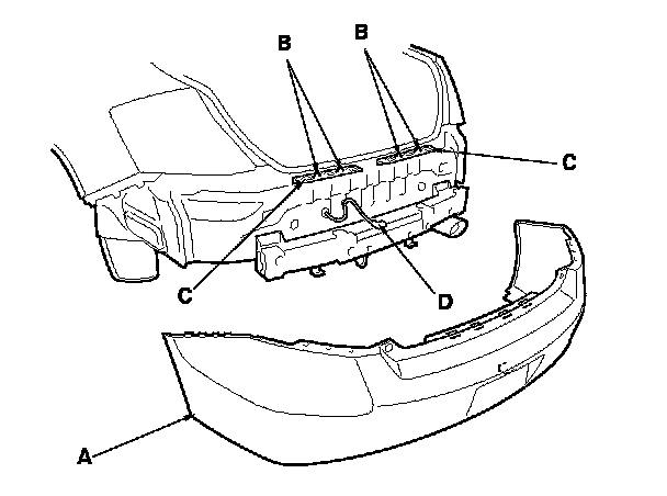 3. With the help of an assistant, while pulling the wheel arch portion away from the side spacers (A), pull the rear bumper (B) to release the bumper from the hooks (C) on the side bracket (D).