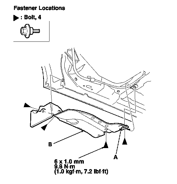 1. Remove the bolts and the nut, and release the hooks (A), then remove the left middle floor undercover (B) and the right middle floor undercover (C).