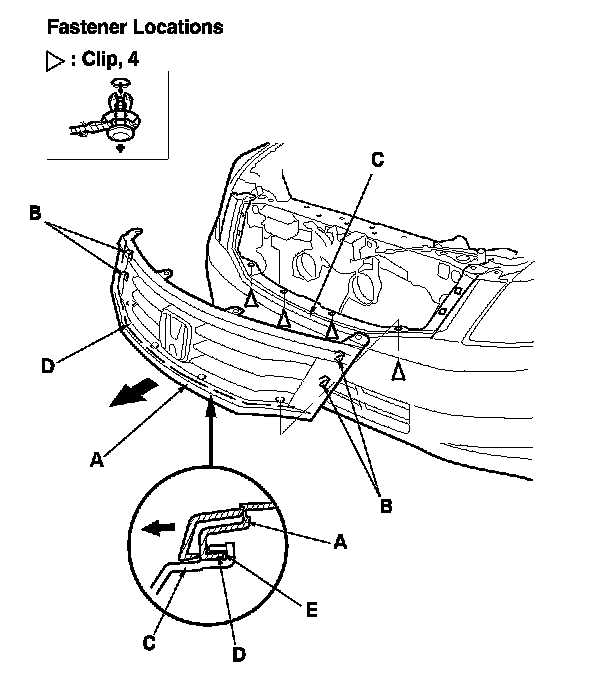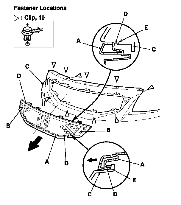 -2 Detach both hooks (B) on the grille from the front bumper (C), and release the ribs (D) on the grille from the groove (E) of the bumper by pulling out the grille.