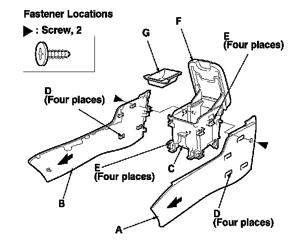 2. Remove the screws securing the driver's side panel (A) and the passenger's side panel (B) from the console box (C), and slide the driver's side panel and the passenger's side panel forward to release the ribs (D) of the panels from the hooks (E) of the box, then remove the panels.