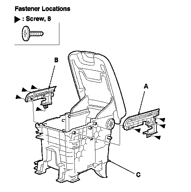 4. Remove the screws, then remove the left box rail (A) and the right box rail (B) by pulling them up from the console box (C).