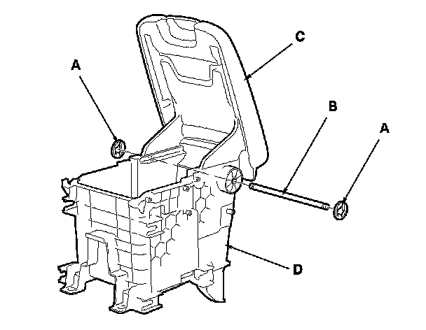 5. Remove the E-clips (A) and the hinge pin (B) from the console armrest (C) and the console box (D).