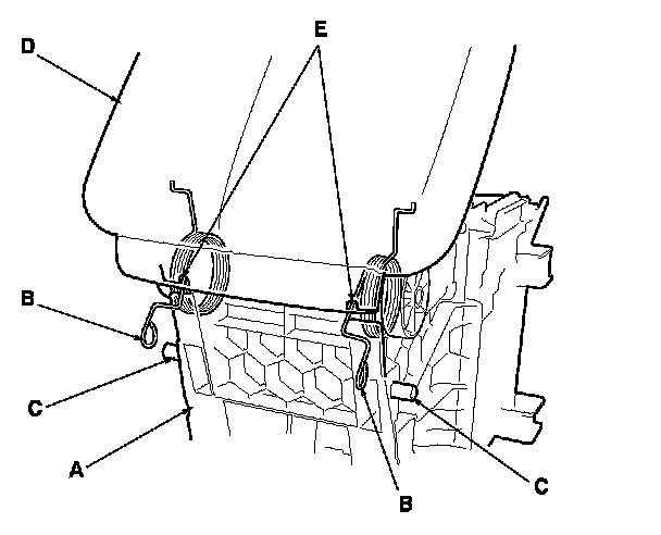 6. From both rear sides of the console box (A), release the opening springs (B) from the bosses (C) of the box, and close the console armrest (D). This rotates the opening springs into the notches (E) on the box.