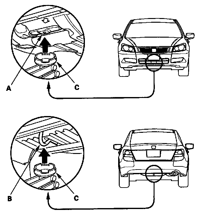 3. Position the floor jack under the front jacking bracket (A) or rear jacking bracket (B). Center the jacking bracket on the jack lift platform (C), and jack up the vehicle high enough to fit the safety stands under it.