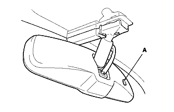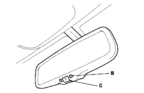 The automatic dimming inside mirror has a front-facing lux level sensor (A), rear-facing lux level sensors (B), and a control unit. The control unit receives signals from each sensor. Based on the difference between the two lux levels (the light outside the vehicle and the light from the headlights of the other vehicle, etc.), the control unit controls the electro-chromic gel to reduce the glare. This dimming function is canceled when the transmission is in reverse, or when the automatic dimming off switch (C) is turned OFF.
