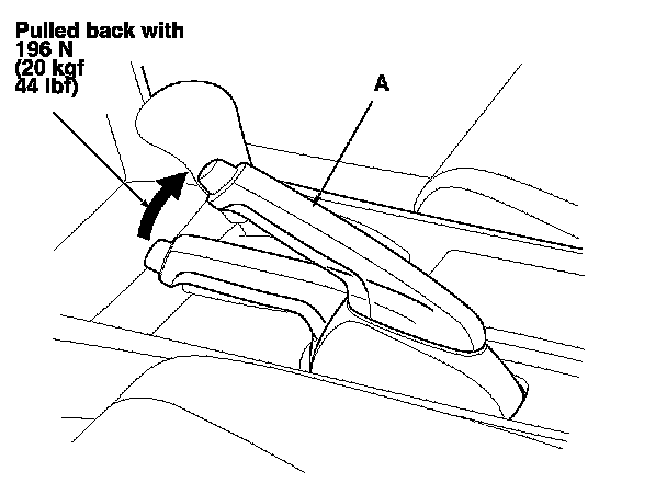 1. Pull the parking brake lever (A) with 196 N (20 kgf, 44 lbf) of force to fully apply the parking brake. The parking brake lever should be locked within the specified number of clicks.