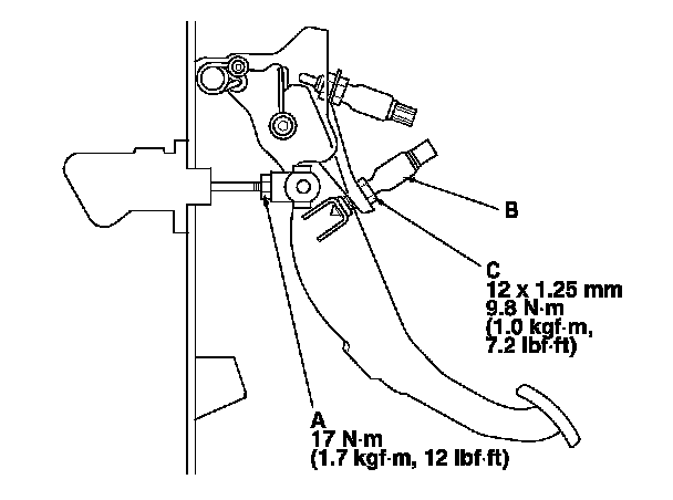 2. Loosen the clutch pedal position switch locknut (A), and back off the clutch pedal position switch (B) until it no longer touches the clutch pedal (C).