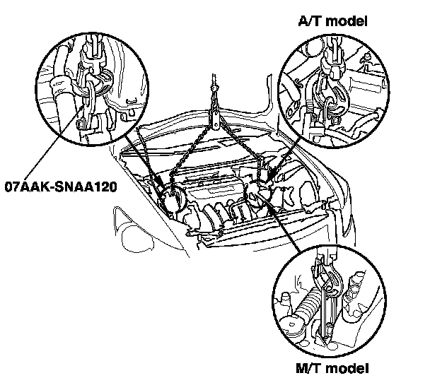 2. Raise the vehicle on the lift, and position the engine/transmission under the vehicle. Lower the vehicle, and install the universal eyelet (07AAK-SNAA120). Attach a chain hoist to the universal eyelet and the transmission hook, then lift the engine into position in the vehicle.