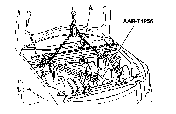 4. Install the engine support hanger (AAR-T1256), then attach the hook to the slotted hole in the engine hanger adapter. Tighten the wing nut (A) by hand to lift and support the engine/transmission.