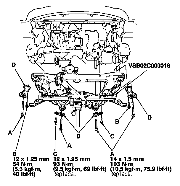 14. Loosely install the new front subframe mounting bolts (four) (A), the 12 x 1.25 mm bolts (four) (B) (C), and the stiffeners (four) (D).