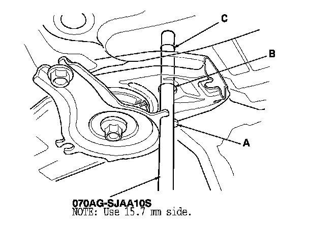 17. Insert the subframe alignment pin (070AG-SJAA10S) through the positioning slot (A) on the right rear stiffener, through the positioning hole (B) on the subframe, and into the positioning hole (C) on the body, then loosely tighten the subframe right rear mounting bolt.