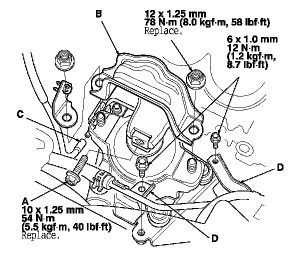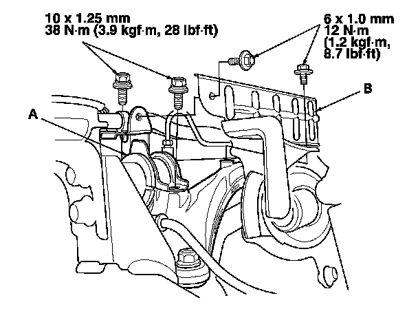 31. A/T model: Install the rear engine mount upper bracket (A), then install the rear engine mount (B).