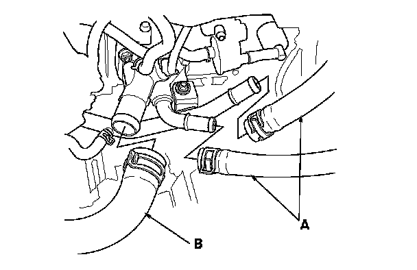 35. Connect the heater hoses (A) and the upper radiator hose (B).