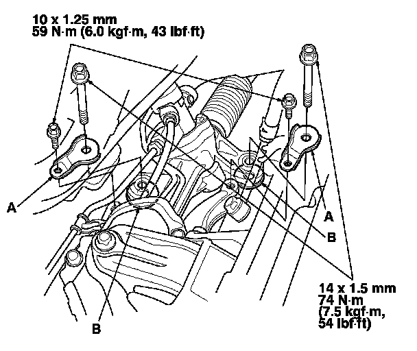 40. Install the bolts securing the steering gearbox mounting bracket (A) and the heat shield (B). (right side)