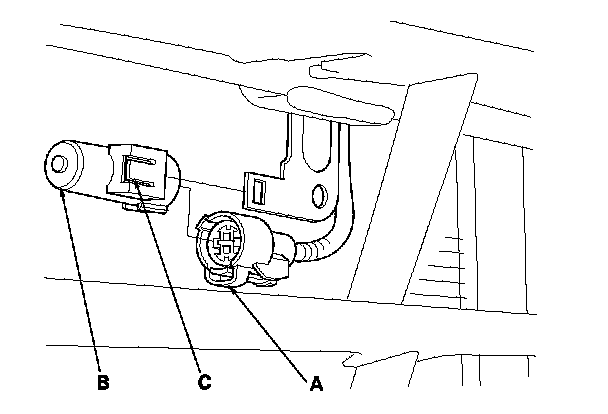 2. Lift the tab (C) to release the lock, then remove the outside air temperature sensor from the front bumper.