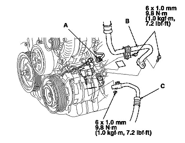 5. Disconnect the A/C compressor clutch connector (A). Remove the bolts and the nut, then disconnect the suction hose (B) and the discharge hose (C) from the A/C compressor. Plug or cap the lines immediately after disconnecting them to avoid moisture and dust contamination.