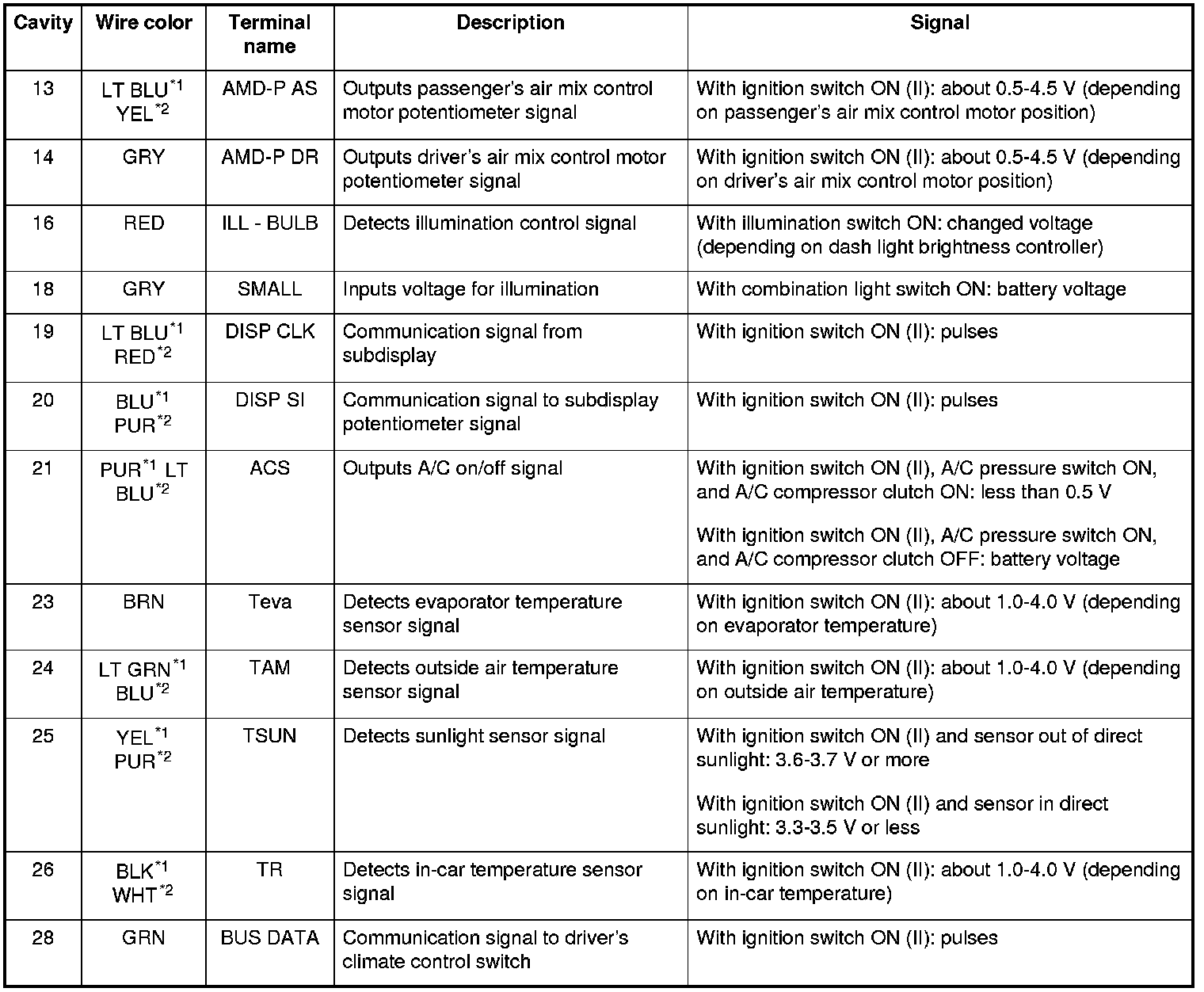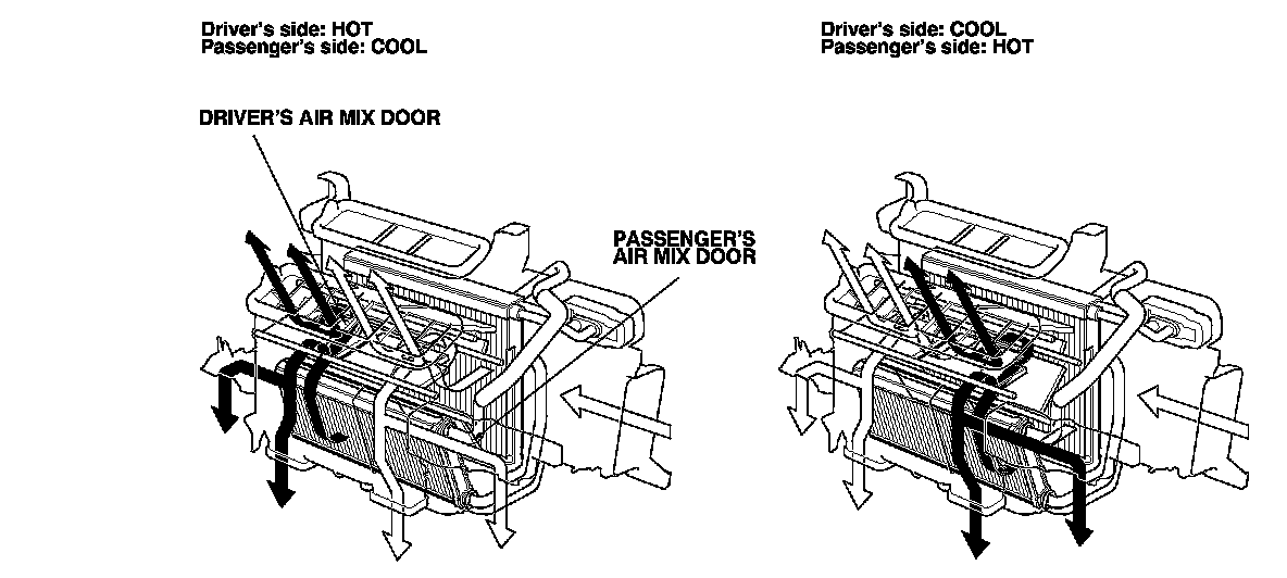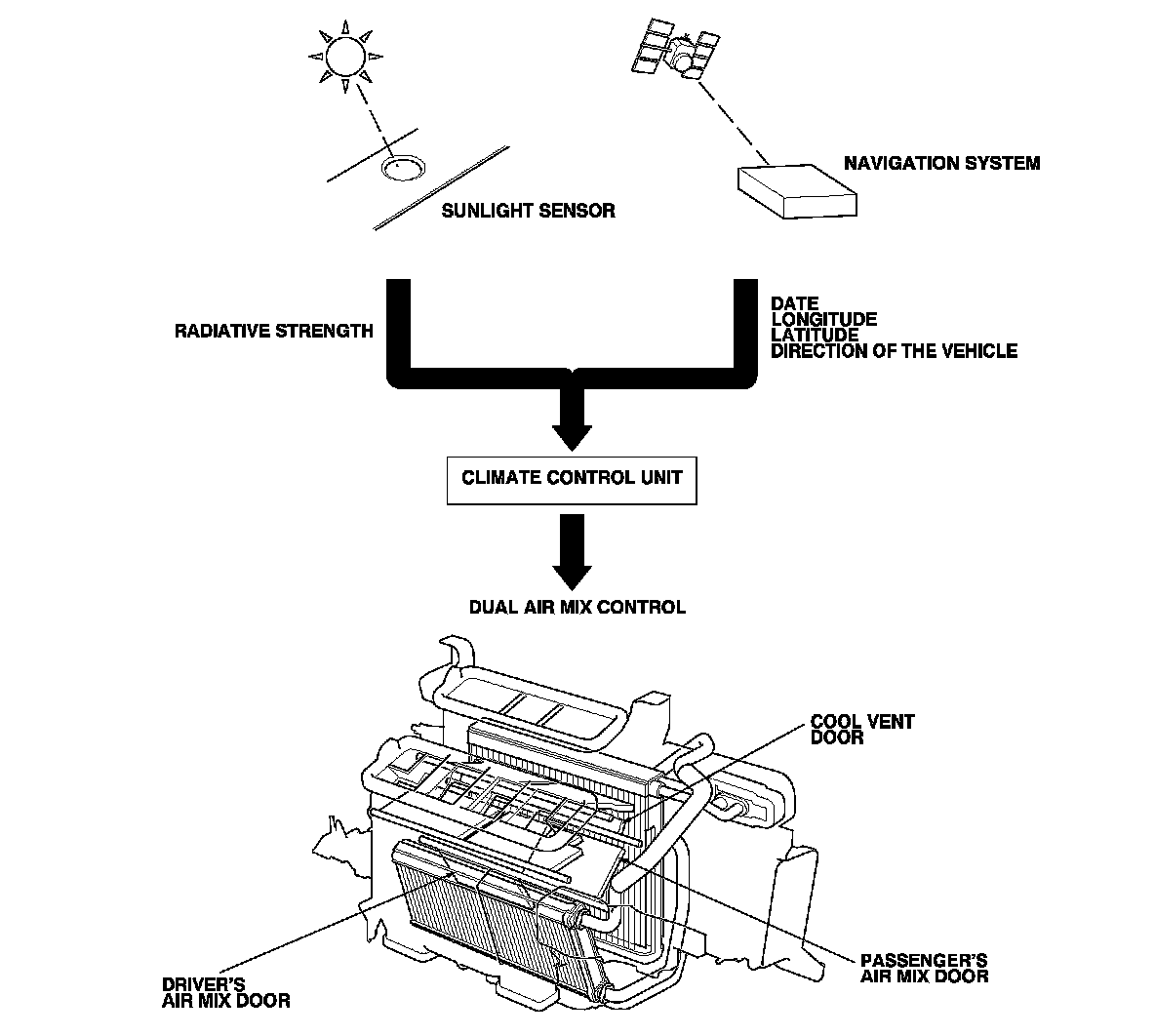 This system automatically controls the temperature and the vent mode of the air direction to the driver and passenger's side depending on the angle of the sun and the direction of the vehicle. It calculates information such as date, time, longitude, and latitude from the navigation system, as well as the radiative strength of the sun from the sunlight sensor, to determine the appropriate mode position and temperature to be directed to each side.