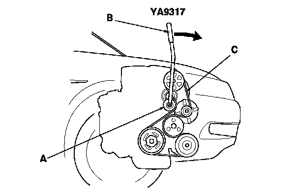 1. Move the auto-tensioner (A) with the belt tension release tool (B) in the direction shown to relieve tension from the drive belt (C), then remove the drive belt.