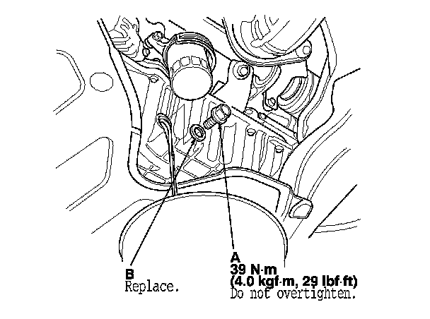 3. Reinstall the drain bolt with a new washer (B).