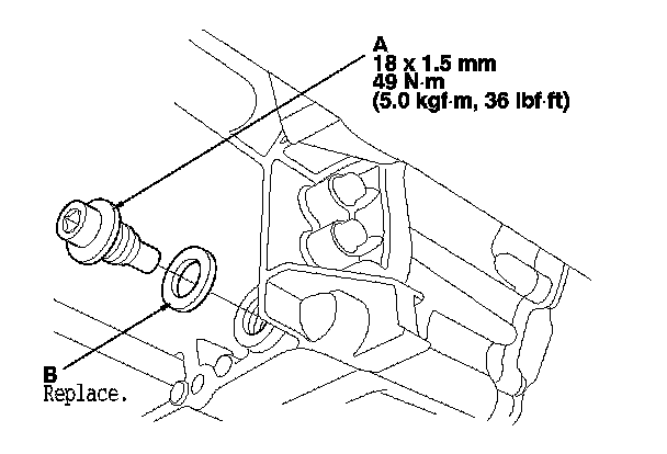 3. Remove the drain plug (A), and drain the automatic transmission fluid (ATF). Then reinstall the drain plug with a new sealing washer (B).