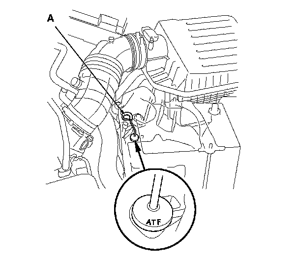 5. Insert the dipstick (A) back into the transmission with the letters "ATF" pointing toward the front of the vehicle.