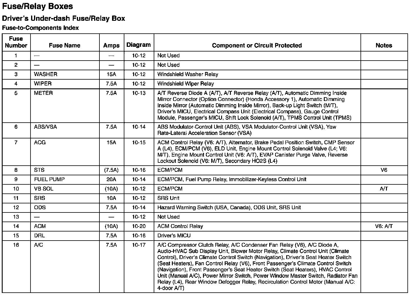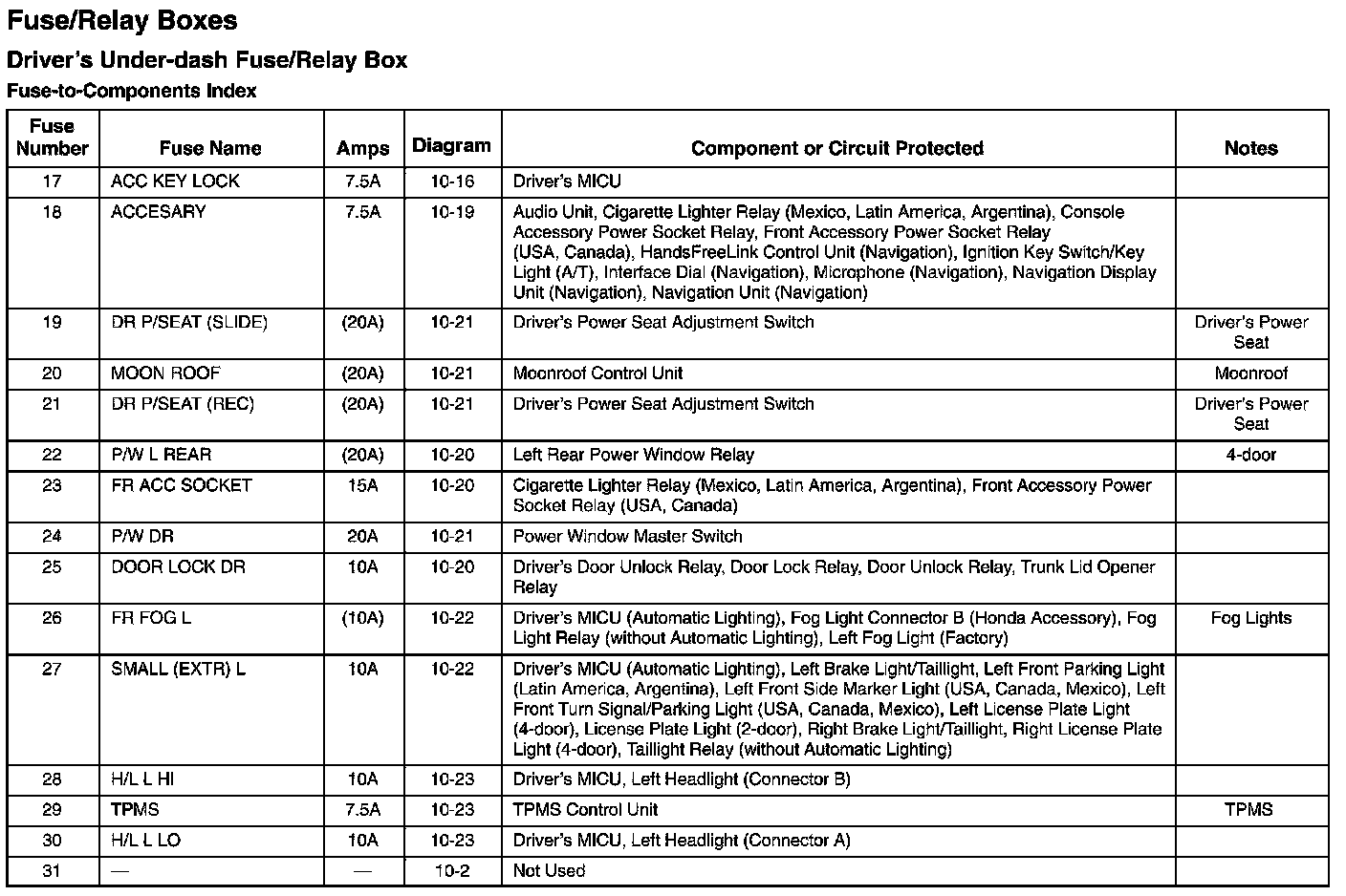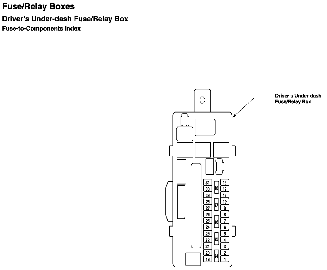 Driver's Under-Dash Fuse/Relay Box - Fuse-to-Components Index