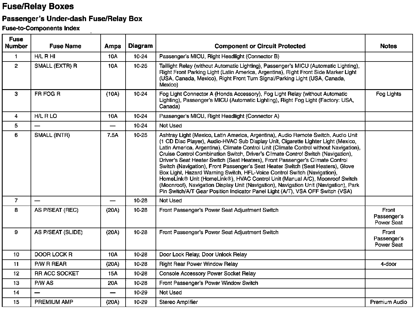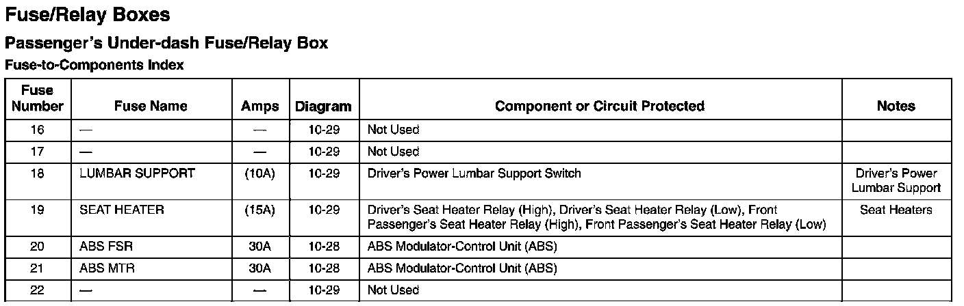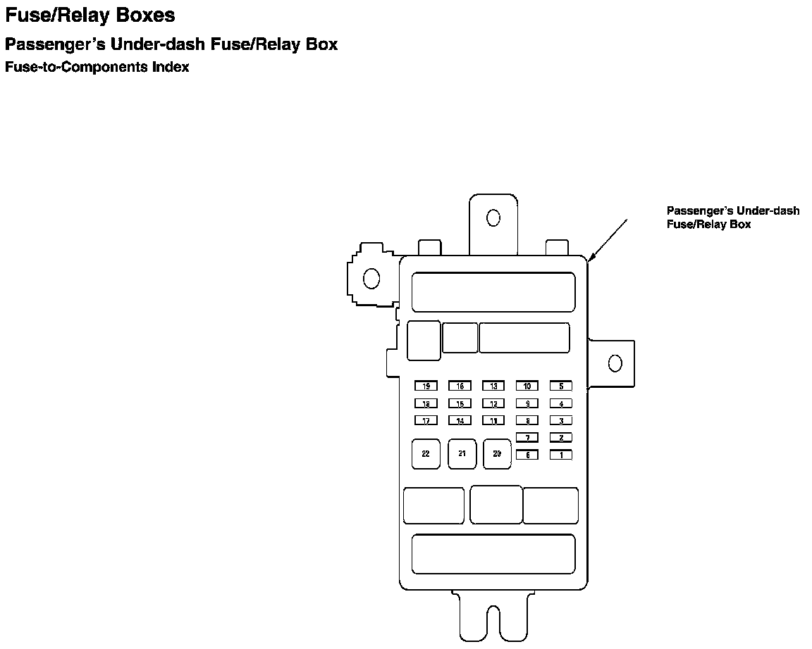 Passenger's Under-Dash Fuse/Relay Box - Fuse-to-Components Index