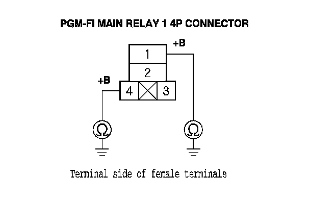 43. Check for continuity between PGM-FI main relay 1 4P connector terminal No. 2 and body ground.
