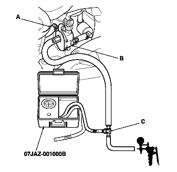 8. Disconnect the vacuum hose (A) from the EVAP canister purge valve (B) in the engine compartment, and connect a T-fitting (C) from the vacuum gauge and the vacuum pump/gauge 0-30 in.Hg, to the EVAP canister purge valve as shown.