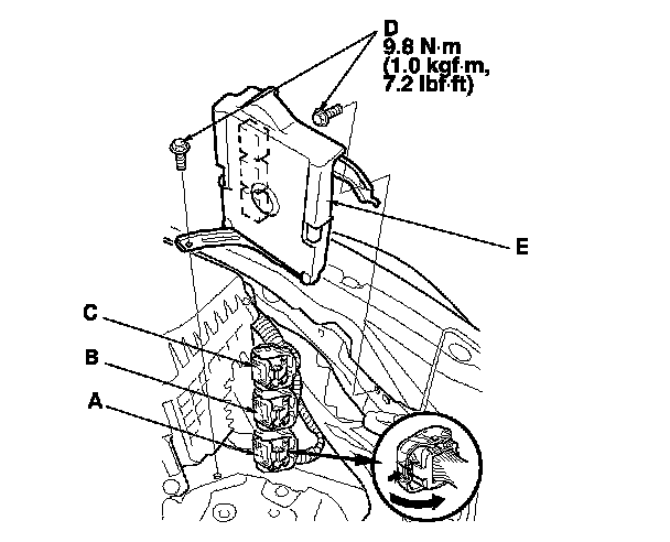10. Disconnect ECM/PCM connectors A, B, and C, then remove the ECM/PCM assembly (E).