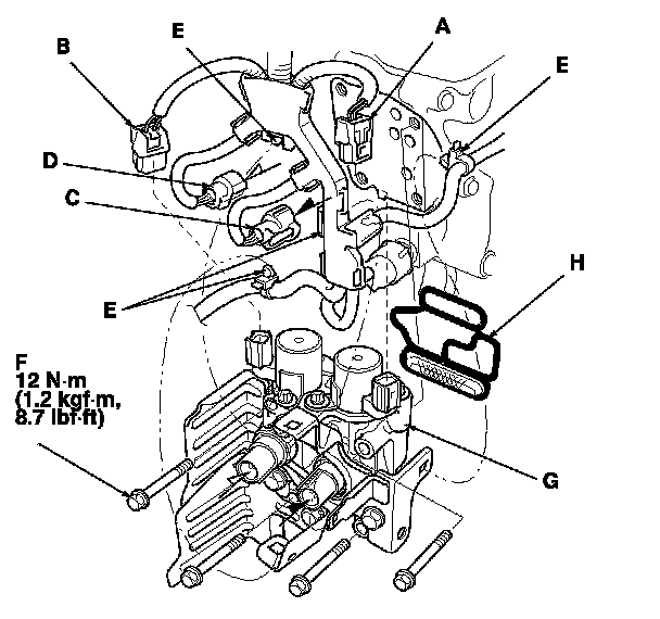 4. Remove the rocker arm oil control valve assembly (G) and the rocker arm oil control valve filter (H).