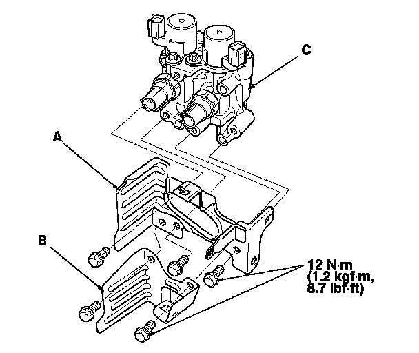 5. Remove the engine wire harness bracket (A) (also (B) (if equipped)) from the rocker arm oil control valve (C).