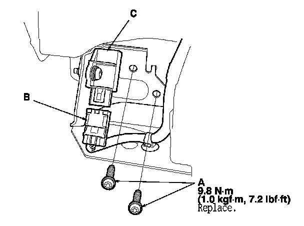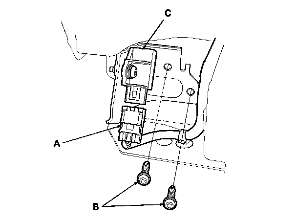 1. Install the front impact sensor with new TORX bolts (A), then connect the left or right engine compartment wire harness 2P connector (B) to the front impact sensor (C).