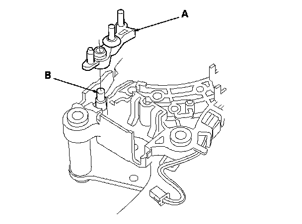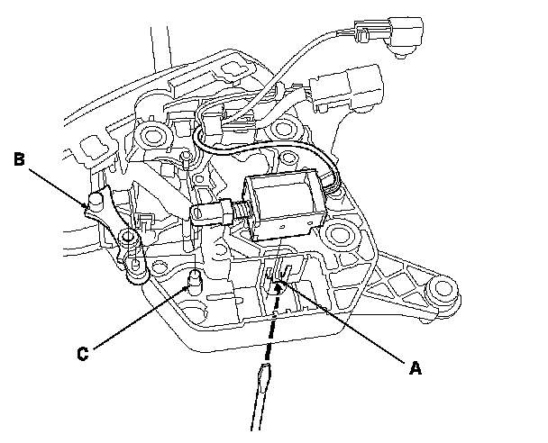 2. Release the lock tab (A) retaining the shift lock solenoid using a thin-bladed screwdriver.