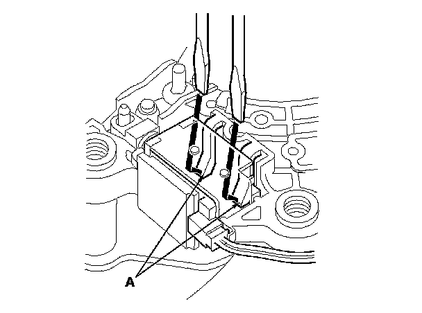 2. Release the lock tabs (A) retaining the shift lock solenoid using thin-bladed screwdrivers.