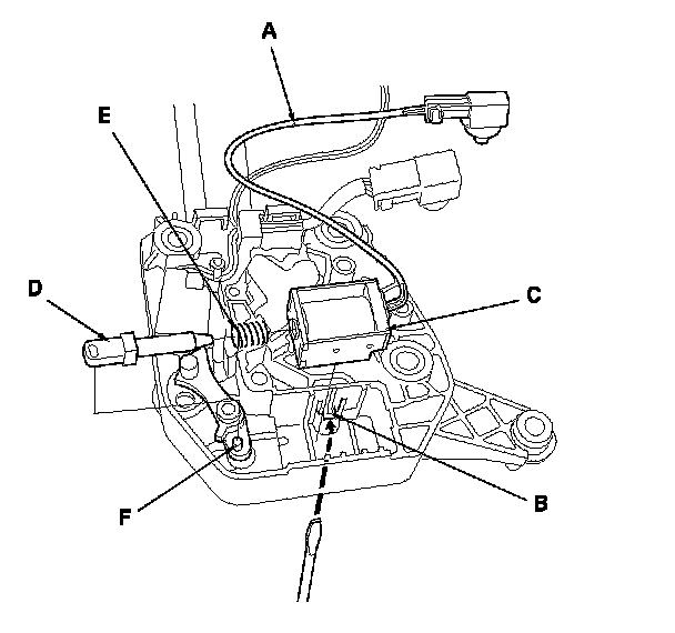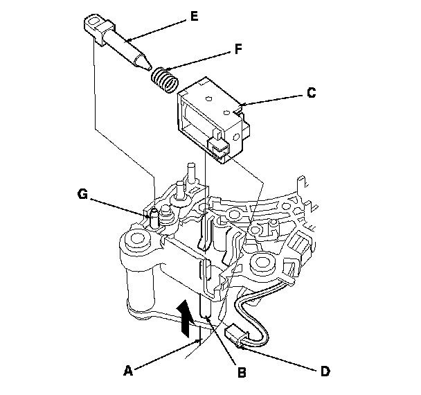 5. Replace the shift lock solenoid, the solenoid plunger (E), and the plunger spring (F) assembly.