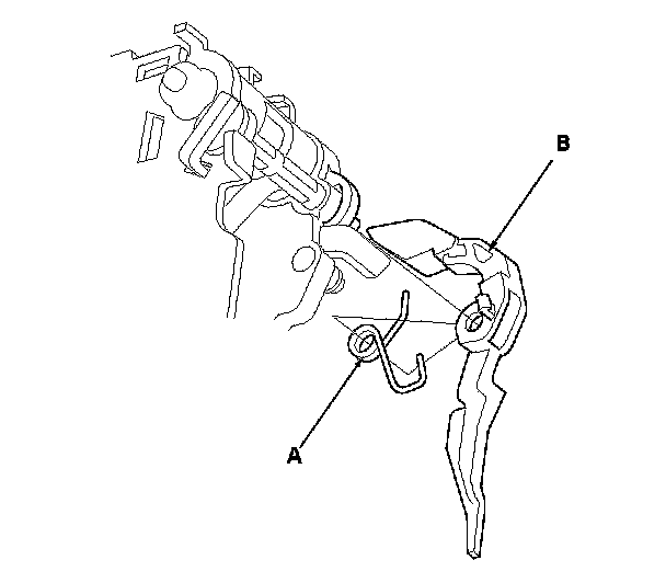 13. Install the shift lock release spring (A) in the shift lock release (B).