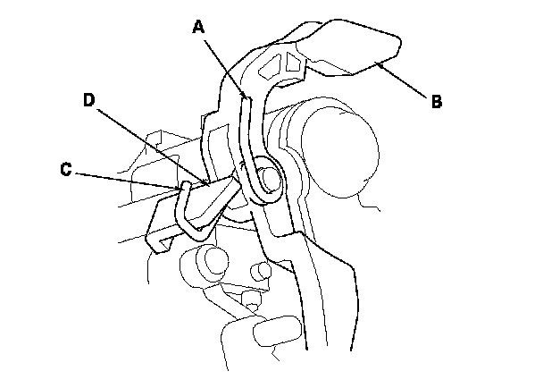 15. Make sure that the release spring end (A) is installed in the shift lock release (B), and the hooked end (C) is on the stop (D).