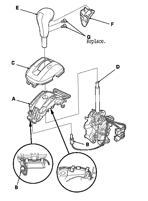 18. Install the shift lever knob cover (F) on the shift lever knob with new screws (G).