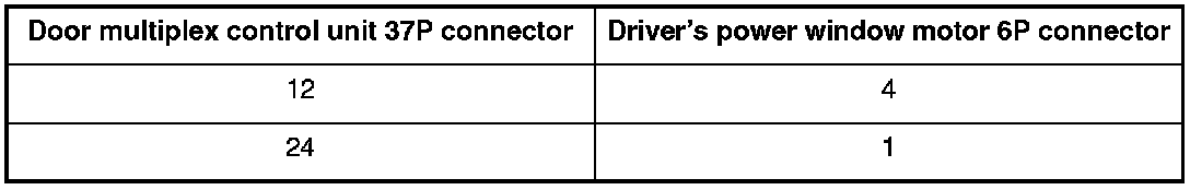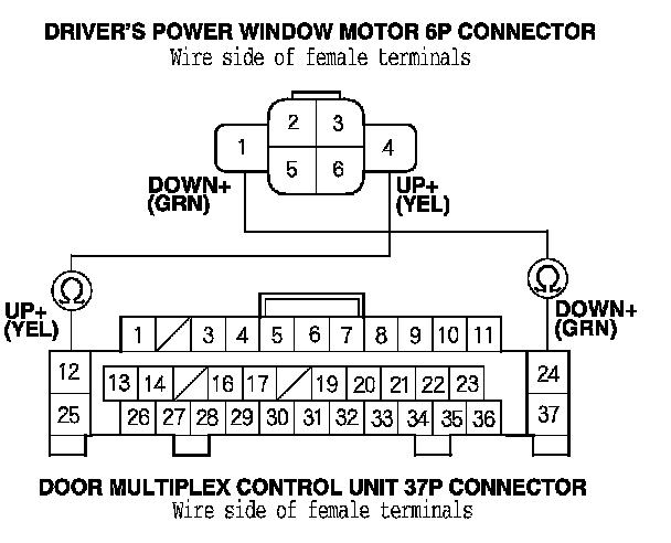 6. Check for continuity between the door multiplex control unit 37P connector terminals and driver's power window motor 6P connector terminals as shown: