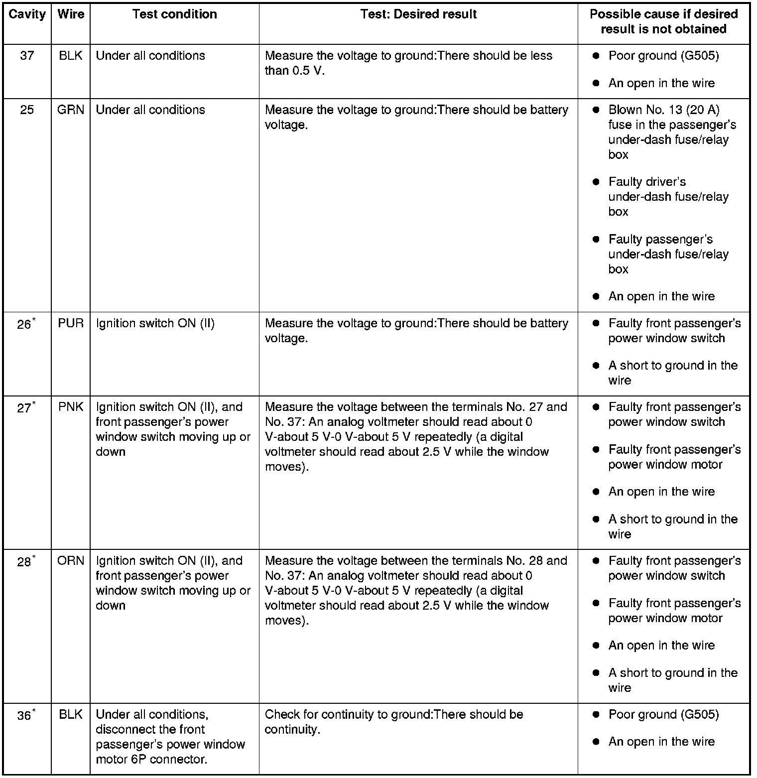 4. Reconnect the connector to the front passenger's power window switch, turn the ignition switch to ON (II), and make these input tests at the connector.