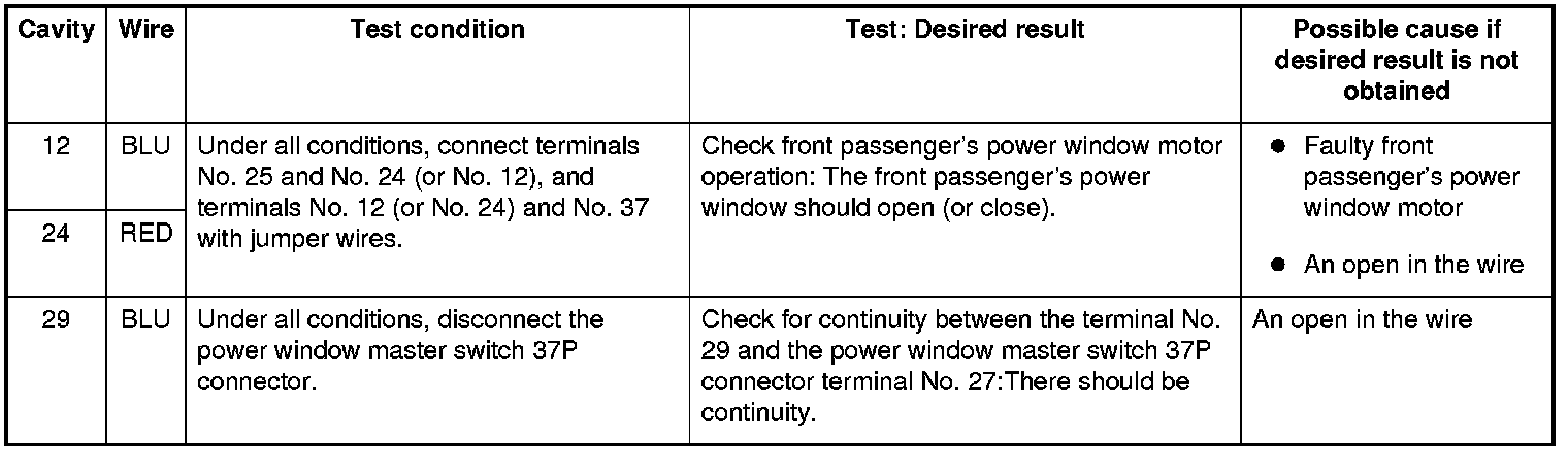 5. Turn the ignition switch to LOCK (0), open and close the driver's door, then disconnect the 37P connector from the front passenger's power window switch again.