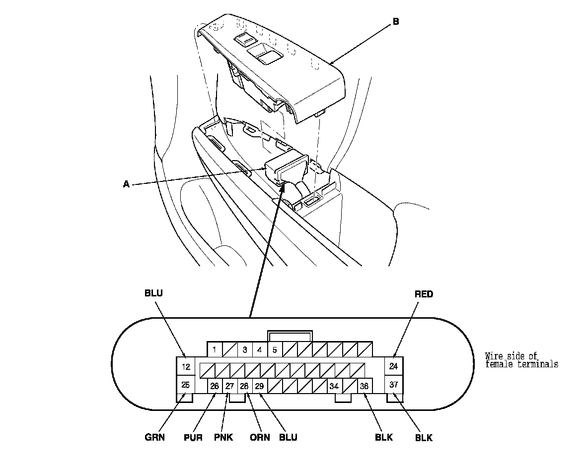 2. Disconnect the 37P connector (A) from the front passenger's power window switch (B).