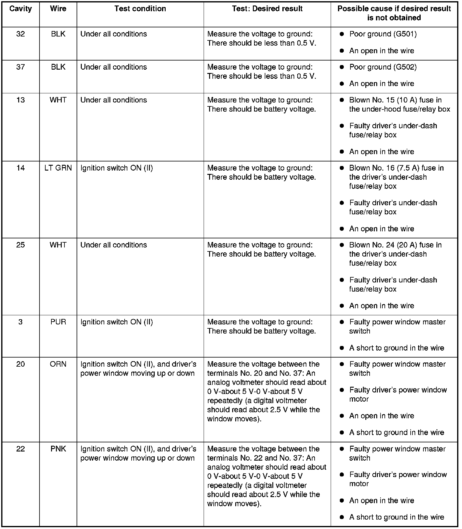 4. Reconnect the connector to the power window master switch, turn the ignition switch to ON (II), and make these input tests at the connector.