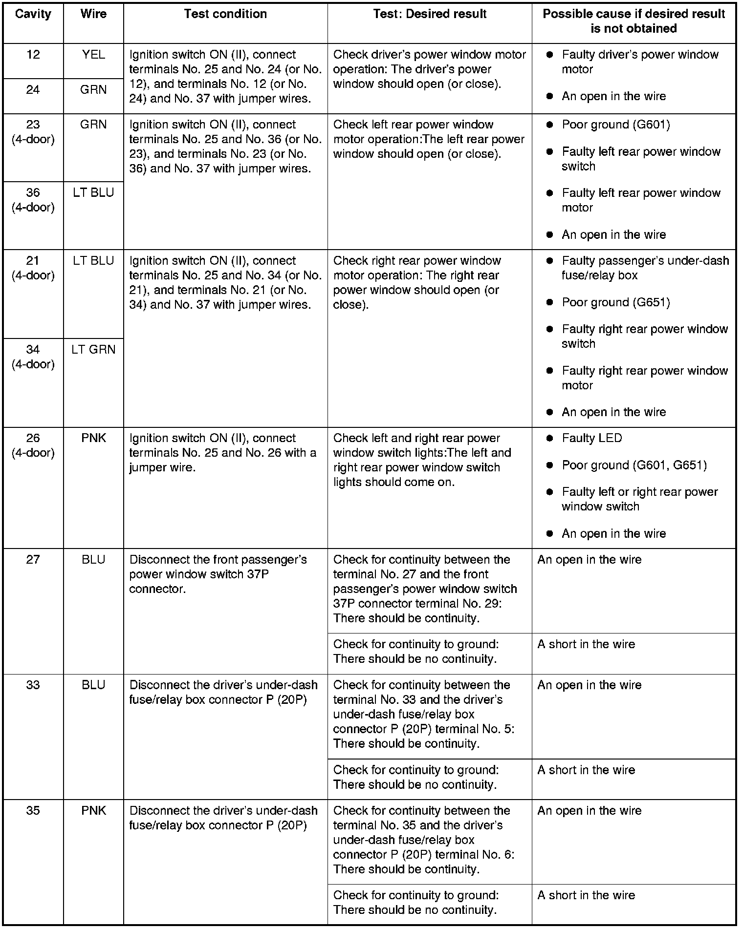 5. Turn the ignition switch to LOCK (0), open and close the driver's door, then disconnect the 37P connector from the power window master switch again.