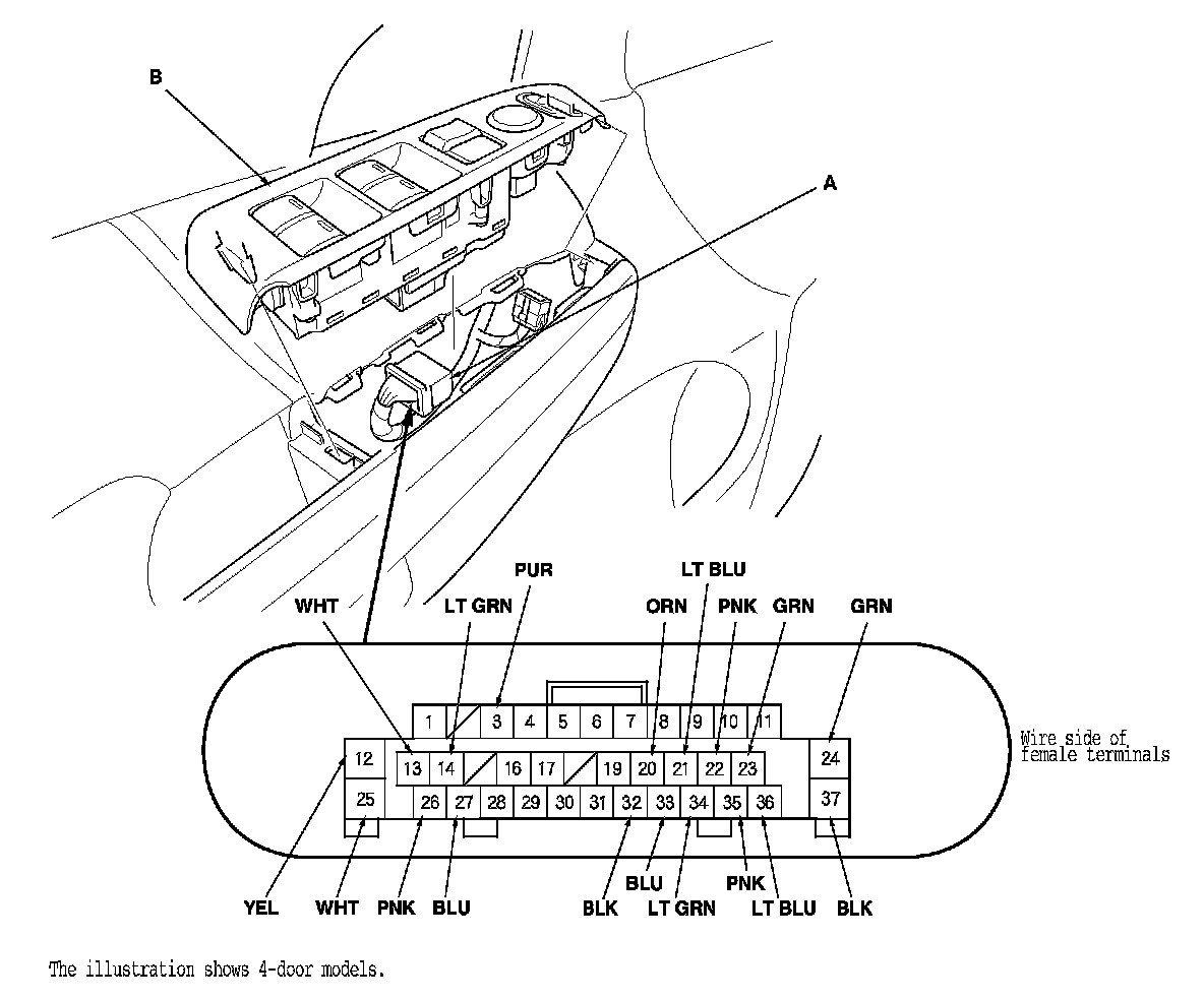 2. Disconnect the 37P connector (A) from the door power window master switch (B).